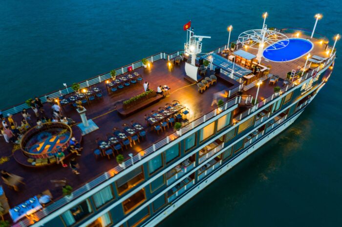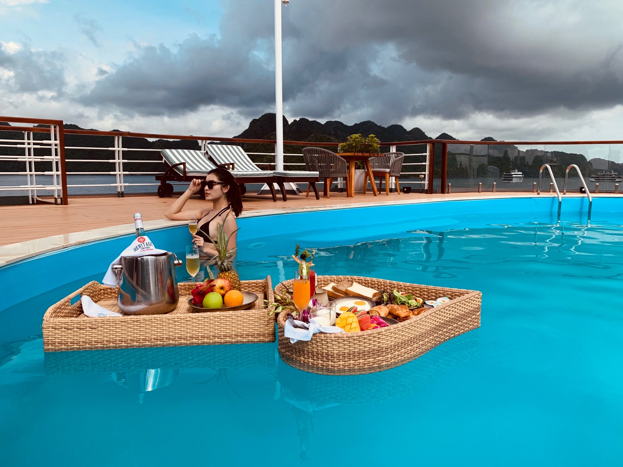 • Phòng nghỉ trên du thuyền sang trọng tiêu chuẩn 5* (có bồn tắm và ban công riêng trong phòng) nhìn ra toàn cảnh Vịnh Lan Hạ • Trải nghiệm 04 BỮA ĂN tại 2 NHÀ HÀNG SANG TRỌNG mang phong cách Bắc Bộ Le Tonkin và Đông Dương L’Indochine • Trải nghiệm lớp học nấu ăn, bài tập buổi sáng vovinam. Các em nhỏ có cơ hội trải nghiệm thực hành tập làm bánh xèo, bánh cuốn • TIỆC TRÀ CHIỀU cùng âm nhạc thật chill tại bể bơi bốn mùa ngắm hoàng hôn tuyệt đẹp. • Thưởng thức KHÔNG GIAN MỸ THUẬT, tranh ảnh những năm 30s • Miễn phí SET UP KHAY NỔI BỂ BƠI cho khách hàng chụp ảnh • Miễn phí sử dụng trang phục truyền thống áo dài trong bữa tối • Miễn phí vé thăm quan và tham gia hoạt động: tắm biển, chèo kayak, 20 phút cano cao tốc tham quan vịnh và thuyền nan tham quan hang động • Miễn phí sử dụng bể bơi 4 mùa trên du thuyền • Sử dụng bồn tắm sục jacuzzi thư giãn trong các hạng phòng Captain và Regal suite • Miễn phí sử dụng phòng tập gym, thư viện, pool bar, Sông Hồng Lounge và khu thư giãn ngoài trời và 100 góc check in tuyệt đẹp và sang chảnh • Chương trình biểu diễn âm nhạc truyền thống (theo yêu cầu) • Miễn phí cung cấp Loa bluetooth ở trong phòng (theo yêu cầu |